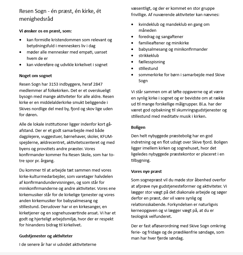 På Præsteforeningens jobportal kan du læse embedsbeskrivelsen fra menighedsrådet. Her kan du læse om pastoratet og om, hvilke tanker, menighedsrådet gør sig om det ledige embede.