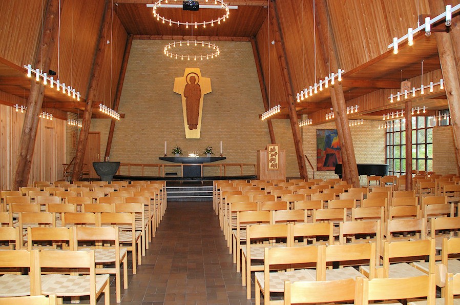 Kirken er indrettet med stole, der kan tilpasses behovet op til 220 siddepladser.