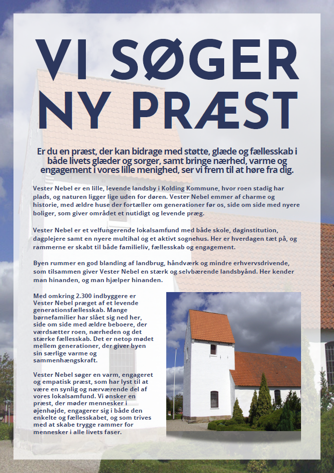 Stillingen som tjenestemandsansat sognepræst i Vester Nebel Pastorat, Kolding Provsti er ledig til besættelse den 1. juli 2026.