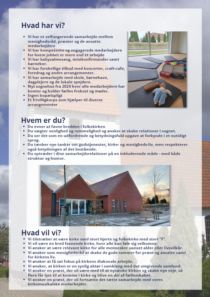 På Præsteforeningens jobportal kan du læse embedsbeskrivelsen fra menighedsrådet. Her kan du læse om sognet og om, hvilke tanker, menighedsrådet gør sig om det ledige embede.