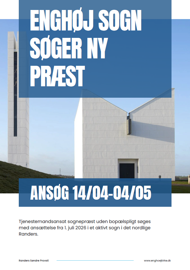 Enghøj Sogn i Randers søger en præst, der har gode samarbejdsevner. En præst, der kan møde mennesker dér, hvor de er, og som har blik for hele sognets bredde, fra de mindste børn til de ældste. En præst, der naturligt forener tradition og fornyelse og har lyst til at være med til at skabe et levende kirkeliv, der taler ind i menneskers hverdag.