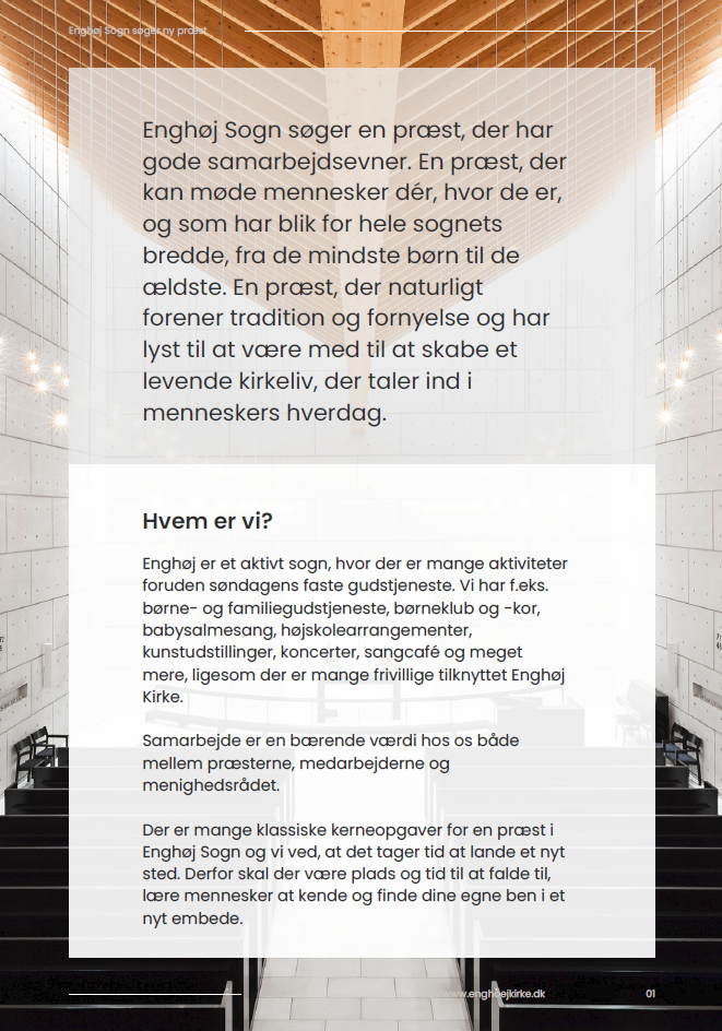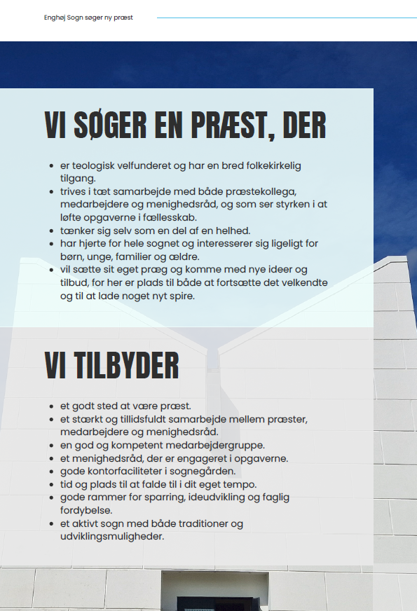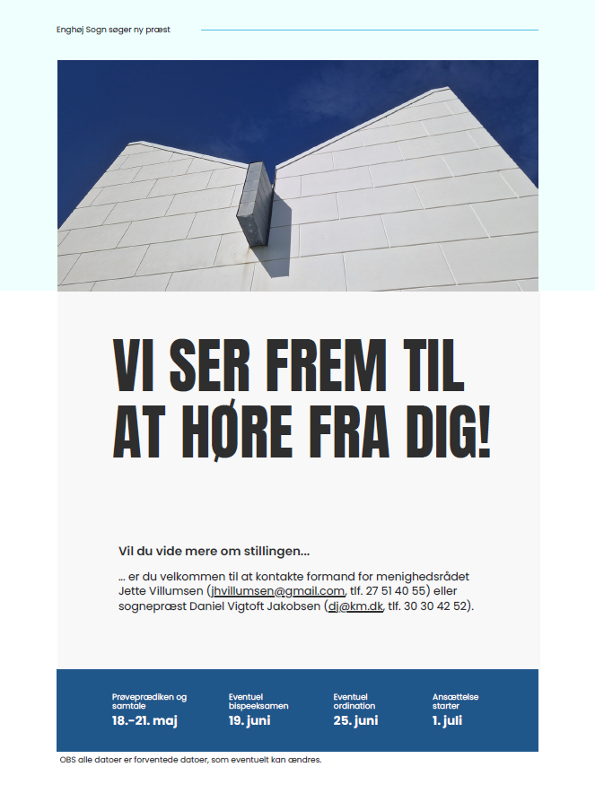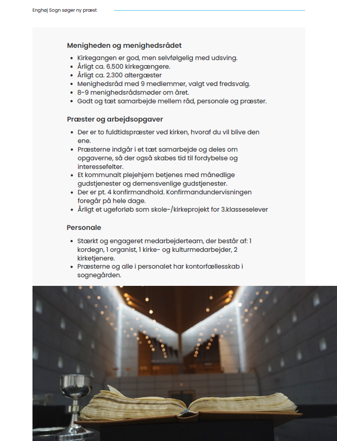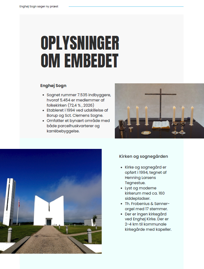 Har du lyst til at læse mere om Enghøj Sogn, og hvordan kirkelivet m.v. er i sognet, kan vi anbefale, at du orienterer dig på sognets hjemmeside: Enghøj Kirke | Enghøj Kirke Embedsbeskrivelsen kan du også læse på Aarhus Stifts hjemmeside Aarhus Stift | Aarhus Stift